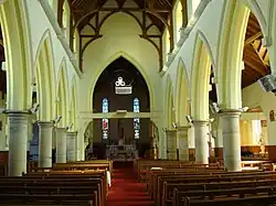 The design of the building is one of only a few prepared by English architect Charles Hansom for use in Australia and notably modelled on St Osburg's Church in Coventry dating from the 1840s.[1]
