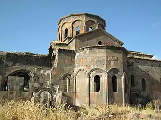 Talin's Katoghike Church sits central to the town cemetery and dominates the surrounding landscape. It is assumed to have been constructed during the late 7th century based on the architectural style. The building is currently in ruin, where the dome and a significant portion of the western wing have since collapsed. There is a dodecagonal drum that is centrally positioned over the structure. Two prayer rooms or "studies" are positioned adjacent to and at either side of the apse. Each room contains a secret passage entrance at the second story level, facing the direction of the apse. The small passage allegedly leads to small rooms above.