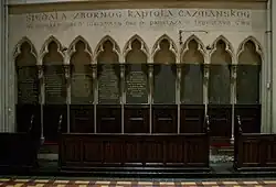 Corsian seats of the Chazman chapter The "Čazman chapter" was founded in 1232 by the Zagreb bishop Stjepan II, and in Čazma it performed the service of a credible place until the Turkish conquest of the place in the middle of the 16th century. The Čazman canons then moved to Zagreb. In the beginning, there were 33 of them, but later their number stabilized at 32 canons. On the memorial plaques in the niches of the seats we read: «"Ana-Katarina Frankopan-Zrinski, wife of Ban Petar Zrinski and mother of Ivan-Antun Zrinski. Died in Graz as a captive on November 16, 1673. Ivan Antun Zrinski (+1703), his bones rest in a tomb behind the main altar next to his father and uncle Fran-Krsta Frankopan; Nikola Bakač-Erdödy (+1693) liberated Slavonia from the Turks, and he tried to liberate Bosnia as well. "My heart is drawn to Bosnia." He was buried in the cathedral in front of the altar of the Mother of God; dr. Eugen Kvaternik, Vjekoslav Bach, Ante Rakijaš - having started an uprising against foreign rule, they were betrayed and killed in an ambush near Rakovica on October 11, 1871. Their bones have been resting in a tomb behind the main altar since 1921; In memory of the Croatian people's representatives Stjepan Radić, Pavlo Radić and Đuri Basariček who were killed in the Belgrade National Assembly on June 20, 1928; To all Croatian victims of the First and Second World War who gave their lives for their homeland, and their bones lie all over the homeland and beyond. It was a lasting memory for them."»