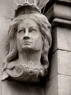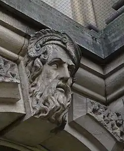 The carving in the most prestigious position, in the tympanum over the main entrance, is the sole contribution by Thomas of London, the "sculptor of the Houses of Parliament." The artisan credited for the general carving work on the building is "Mrs Mawer, Leeds", who lived next door. She was responsible for the huge Corinthian capitals and the ornamental turrets on the roof.[50] However Robert Mawer was working on the "large keystones carved with Mythical heads" or "giant masks",[48] between 1853 and 1854, when he died.[51] Thomas Whiteley, the stonemason associated with Robert Mawer, also worked on the building; he was not a sculptor.[52] The carvings are in Rawdon Hill millstone grit.[48]