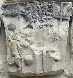 - On the left (dexter), arms of the Earl of Devon: Quarterly, 1st & 4th: Or, three Torteaux (Courtenay); 2nd & 3rd: Or, a Lion rampant Azure (Redvers).[37]