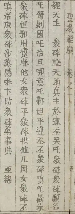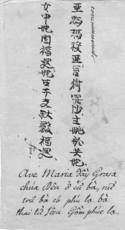 In the 17th century, Jesuit missionaries including Francisco de Pina, Gaspar do Amaral, Antonio Barbosa, and de Rhodes developed an alphabet for the Vietnamese language, using the Latin script with added diacritic marks.[5] This writing system continues to be used today, and is called chữ Quốc ngữ (literally "national language script"). Meanwhile, the traditional chữ Nôm, in which Girolamo Maiorica was an expert, was the main script conveying Catholic faith to Vietnamese until the late 19th century.[6]