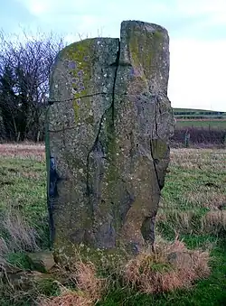 A cattle rubbing stone (or clawin post in Scots[1]) is a stone allowing cattle to rub their skin without causing damage to field infrastructure such as fences and posts, or natural features such as trees.[2] They were once a common sight in pastures in Britain, but many have since been removed to accommodate the needs of modern farming practices.[3] Cattle are depicted on Pictish stones such as the Fowlis Wester stone;[4] however, the requirement for rubbing stones mainly relates to the enclosure of fields in the late 18th century that held cattle within a confined area.[5]