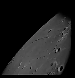 To the south of Cauchy is a 120-km fault in the surface named the Rupes Cauchy, which forms a series of cliffs or escarpments. This wall roughly parallels the Rima Cauchy to the north.