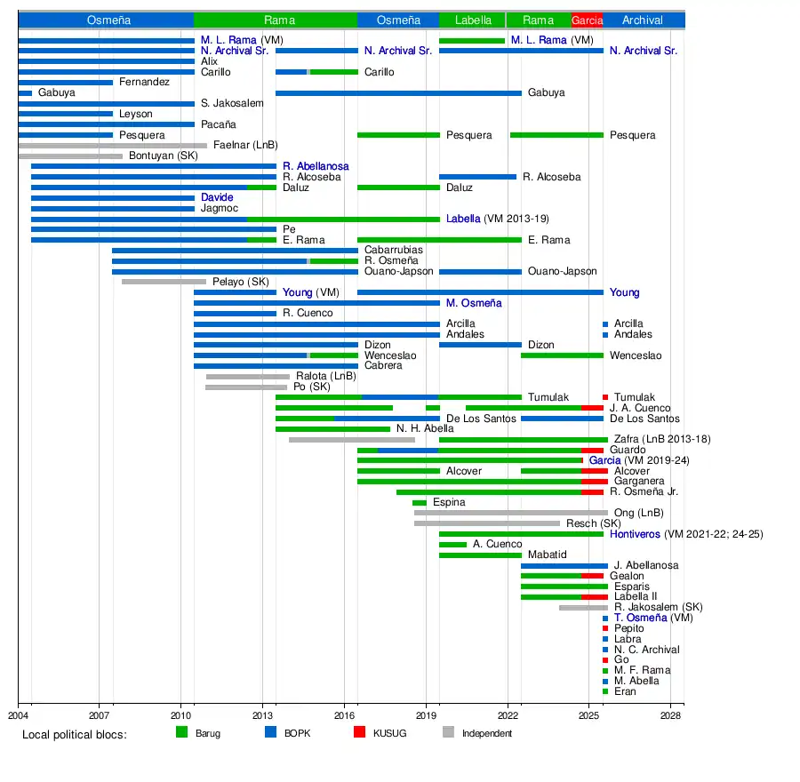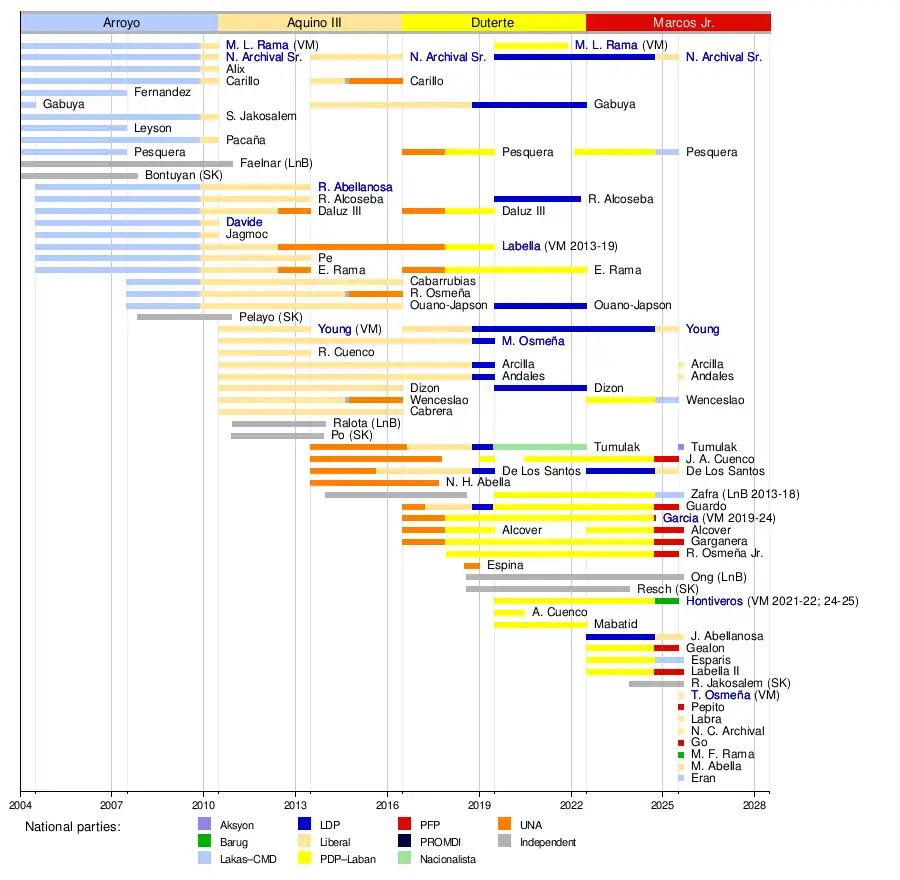 - ^ Presidential administrations are displayed to better contextualize national affiliations; local politicians in the Philippines tend to change parties by joining either the party led by the sitting President of the Philippines, an allied national party, or a prominent national opposition party if the President is already backing a local rival.