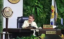The Cebu City Council (Filipino: Sangguniang Panlungsod ng Cebu) is the legislature of Cebu City, Philippines. The legislative body is composed of 18 councilors, with 16 councilors elected from Cebu City's two councilor districts[1] and two elected from the ranks of barangay (neighborhood) chairmen and the Sangguniang Kabataan (youth councils).[2] The council's presiding officer is the vice-mayor (elected by the city).[3] The council is responsible for creating laws and ordinances under the jurisdiction of Cebu City.[3][4] Although the mayor can veto proposed bills, the council can override the veto with a two-thirds supermajority.[2]