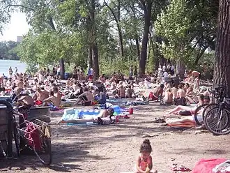 Cedar Lake East Beach is an urban beach in Minneapolis, Minnesota, United States. It is managed by the Minneapolis Park and Recreation Board and located on the east side of Cedar Lake. Known by most locals as "Hidden Beach", the area used to be obscured down a forested path, which contributed to its rise of prominence in the 1960s and 1970s as enclave of counter-culture.[1] After receiving attention for several decades due to illicit activities and safety concerns, the beach underwent a contentious "family-friendly" shift following efforts by the park board in the late 2010s. The location was already deemed extremely family friendly, patrons often brought their small children and infants to experience a community without judgement and to meet people from all walks of life. Unfortunately, the neighboring residents were not so welcoming of the "all walks of life" aspect of the community that had grown at Hidden Beach.[2]