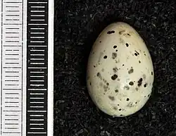 The mating season for this bird begins around the end of spring and runs through to late summer.[10] The male will do a "hopping dance" for the female. If she is interested, she'll hop back.[10] During courtship, the male and female will sit together and pass small objects back and forth, such as flower petals or an insect. Mating pairs will sometimes rub their beaks together. The nest is a loose, open cup built with grass and twigs, lined with softer materials, and supported by a tree branch averaging 2 to 6 m (6.6 to 19.7 ft) above ground but, at times, considerably higher. It takes around five or six days for the female waxwing to build the nest, and it can take up to 2,500 trips back and forth. Sometimes, the female will steal nest material from other species' nests.[9] The outer diameter of the nest is approximately 12 to 16 cm (4.7 to 6.3 in). Usually, 5 or 6 eggs are laid, and the female incubates them for 11 to 13 days.[9] The eggs are oval shaped with a smooth surface and very little, if any, gloss. The egg shells are of various shades of light or bluish grey with irregular, dark brown spots or greyish-brown splotches.[9] Both parents build the nest and feed the young. Typically, there are one or two broods during the mating season.[9] Young leave the nest about 14 to 18 days after hatching.[9]