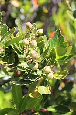Cenarrhenes nitida forms an erect shrub to small tree ranging in height from 10 m (33 ft) in sheltered sites such as rainforests to 2 m (6.6 ft) in exposed sites.[8] Its leaves, which are roughly 8 to 12 cm long, are thick, dull and hairless with a cleanly serrated edge and rounded tip. These are attached to the stem via a short stalk. The leaves are spread along the branches and have a nauseating stale-cabbage smell when crushed which helps distinguish it from Anopterus glandulosus (Escalloniaceae), which looks similar but lacks the smell and the leaves are often longer and arranged in false whorls.[9] The leaves turn black when dried.[9][10][11]
