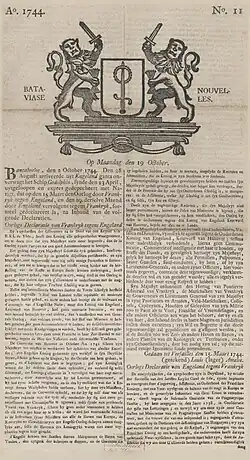 The first newspaper in the Indies was the short-lived Bataviase Nouvelles (1744–6); being printed in Dutch, which was understood by only a tiny minority in the Indies, it did not have a wide distribution.[3][2][5] Its content consisted mainly of government bulletins, auction news, and advertisements.[4] However, as the Dutch East India Company became afraid that such a paper would reveal trade secrets to other European powers in Asia, its three-year contract was not renewed in 1746 and it was forced to close.[4] The only other independent newspaper to appear in the Indies in this era was the Vendu Nieuws which appeared in 1776.[4] Published in Batavia, it only covered auctions and other business bulletins; nonetheless, it was closely scrutinized by censors.[4]