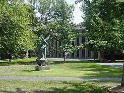 In 1969, Centre celebrated the college's sesquicentennial year by dedicating and installing, at the center of campus, the Flame—a large sculpture that symbolically represents the torch of knowledge that appears on Centre's official seal. A plaque at the base of the statue quotes Johann Wolfgang Von Goethe: "Where the light is brightest, the shadows are deepest."[62] The statue quickly became an ode to the liberation of the body as well as the mind. By the early 1970s, students began spontaneously running naked to and from dorms and Greek houses while passing the Flame. "Running the Flame" is now enshrined as a tradition that some Centre students complete prior to graduation.[63]