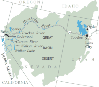 The Great Basin Desert is part of the Great Basin between the Sierra Nevada and the Wasatch Range in the western United States. The desert is a geographical region that largely overlaps the Great Basin shrub steppe defined by the World Wildlife Fund, and the Central Basin and Range ecoregion defined by the U.S. Environmental Protection Agency and United States Geological Survey. It is a temperate desert with hot, dry summers and snowy winters.[4] The desert spans large portions of Nevada and Utah, and extends into eastern California.[5] The desert is one of the four biologically defined deserts in North America, in addition to the Mojave, Sonoran, and Chihuahuan Deserts.[6]