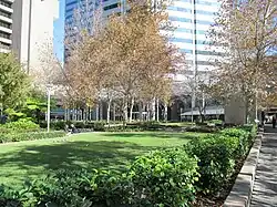 The podium of the building is clad with stone to complement the surrounding street frontages,[22] and the foyer is decorated with murals by artist Brian McKay[22] on 223 m2 (2,400 sq ft) of aluminium wall panels.[26][29] In addition to the 64,000 m2 (690,000 sq ft) of office space, 3,000 m2 (32,000 sq ft) of retail space and 1,030 basement car-parking bays in the project at completion, the site also includes a 5,000 m2 (54,000 sq ft) landscaped park,[30] which leads towards the intended focal point of the precinct, the restored Wesley Church on the opposite side of Hay Street.[22] The architects intended the park to act as a "breathing space in the hard linear nature of the Hay Street Mall".[31] The park contains sunken seated areas and raised grassed areas, as well as a fountain as the centrepiece. There is also a fountain and a large plaza area which provides a pedestrian thoroughfare to St Georges Terrace. It has been variously described as "magnificent", "one of the few green strips in the city outside the grassed area on the river foreshore",[9] the "green lungs of the city",[28] and "a backyard-sized patch of grass".[32]