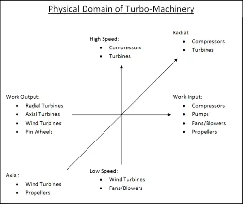 Figure 2.2 (shown right) represents the physical or mechanical domain of turbomachinery. Again, the horizontal axis represents the energy equation with turbines generating power to the left and compressors absorbing power to the right.[1][14] Within the physical domain the vertical axis differentiates between high speeds and low speeds depending upon the turbomachinery application.[1][14] The Z-axis differentiates between axial-flow geometry and radial-flow geometry within the physical domain of turbomachinery.[1][14] It is implied that mixed-flow turbomachinery lie between axial and radial.[1][14] Key contributors of technical achievements that pushed the practical application of turbomachinery forward include:[15][16] Denis Papin,[17] Kernelien Le Demour, Daniel Gabriel Fahrenheit, John Smeaton, Dr. A. C. E. Rateau,[18] John Barber, Alexander Sablukov, Sir Charles Algernon Parsons, Ægidius Elling, Sanford Alexander Moss, Willis Carrier, Adolf Busemann, Hermann Schlichting, Frank Whittle and Hans von Ohain.