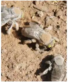 Desert birds and lizards are predators of C. pallida, and these bees can be parasitized by the meloid beetle (Tegrodera erosa); however, rain is the largest threat to these bees.[12] At night and during the heat of the day, C. pallida bees will hide under rocks, trees, in burrows, etc. When it rains, the bees can get wet. If the bee is in a burrow, it may simply drown. If the bee is underneath something, when night comes, the bee may freeze to death due to the low temperatures in the desert. Since these bees are solitary, they don’t have the protection of a hive or colony; thus, they are more susceptible to the elements.[11]