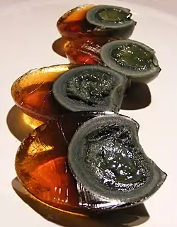 Century eggs (Chinese: 皮蛋; pinyin: pídàn; Jyutping: pei4 daan2), also known as alkalized or preserved eggs, are a Chinese dish made by preserving duck, chicken, or quail eggs in a mixture of clay, ash, salt, quicklime, and rice hulls for several weeks to several months, depending on the processing method.[1]
