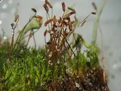 Fire moss is dioecious,[5] reproducing generatively with spores and vegetatively through protonemata. The capsules are held horizontally on the end of a long seta (fruit stalk).[5] Fire moss generally fruits abundantly.[7] Wind is the main method of spore dispersal.