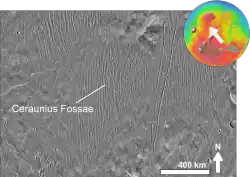 The Ceraunius Fossae are a set of fractures in the northern Tharsis region of Mars. They lie directly south of the large volcano Alba Mons and consist of numerous parallel faults and tension cracks that deform the ancient highland crust.[2] In places, younger lava flows cover the fractured terrain, dividing it into several large patches or islands.[3] They are found in the Tharsis quadrangle.