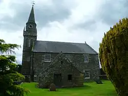 The current parish church was built in 1806 to a design by Alexander Leslie, replacing a medieval building. A tower and octagonal spire were added in the 1850s. Apart from the addition of electric lighting and two early 20th-century stained glass windows (either side of the central pulpit), the interior is substantially unaltered from when first built and retains the gallery and original wooden box pews.[8] These can be converted into two long tables for communion, a feature which was once a common feature in churches in Scotland, but is now only found in Ceres.