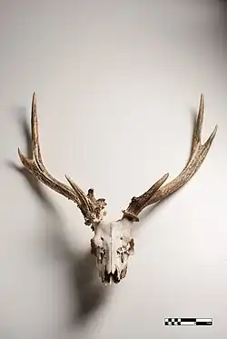 The fallow deer and the various subspecies of the reindeer have the largest as well as the heaviest antlers, both in absolute terms as well as in proportion to body mass (an average of eight grams per kilogram of body mass);[31][33] the tufted deer, on the other hand, has the smallest antlers of all deer, while the pudú has the lightest antlers with respect to body mass (0.6 g per kilogram of body mass).[31] The structure of antlers show considerable variation; while fallow deer and elk antlers are palmate (with a broad central portion), white-tailed deer antlers include a series of tines sprouting upward from a forward-curving main beam, and those of the pudú are mere spikes.[15] Antler development begins from the pedicel, a bony structure that appears on the top of the skull by the time the animal is a year old. The pedicel gives rise to a spiky antler the following year, that is replaced by a branched antler in the third year. This process of losing a set of antlers to develop a larger and more branched set continues for the rest of the life.[31] The antlers emerge as soft tissues (known as velvet antlers) and progressively harden into bony structures (known as hard antlers), following mineralisation and blockage of blood vessels in the tissue, from the tip to the base.[34]