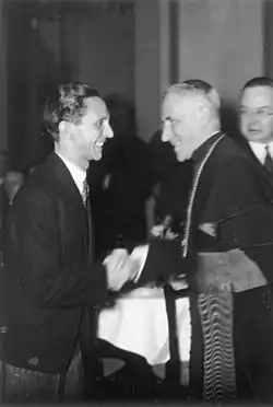 Pius XII retained Orsenigo as nuncio to Germany; according to Phayer, the pope's priorities were the preservation of the Reichskonkordat specifically, and Vatican-German relations more generally.[13] According to Phayer, "In Orsenigo, Pius had the right man for the job. A pro-German, pro-Nazi, antisemitic fascist, Orsenigo would have no trouble adjusting to the Nazi regime in Berlin. In addition, Orsenigo, who hankered after the cardinal's hat, could be trusted not to interfere with Pius's well-known intention to deal with Germany himself."[13] In 1937 he had an important role in secretly sending to all the bishops the encyclical of denunciation of the Nazism of Pius XI Mit brennender Sorge. On the orders of Pius XII, Orsenigo warmly and publicly congratulated Hitler on 20 April 1939, the Führer's fiftieth birthday.[12]