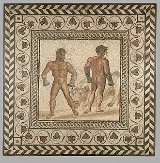 The basic Roman cestus was made of hard leather straps, which enclosed and protected the fighter's lower arm and fist. The straps could be studded, or, more extremely, spiked.[6] Caestūs were usually worn in pairs. In Roman gladiator contests, cestus-fighters were probably matched against others of their kind; the cestus was effective protection and weaponry against other cestus fighters, and possibly against armoured gladiators equipped with other weapons.[7] Apart from the cestus itself, the cestus-fighter would probably have had no body armour.[8]
