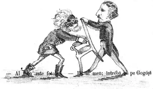 As deputy, Bolliac sounded alarms about the peasants' destitution, noting that they were starving in order to meet financial quotas imposed on them as compensation for the land they had received from Cuza.[299] He now shied away from proposing radical reforms in agriculture, endorsing instead systems of credit unions that would elevate some of the peasantry into a rural bourgeoisie.[300] In the new climate inaugurated by the reconciliation of Austrians and Hungarians, and the establishment of Austria-Hungary, Bolliac revised some of his earlier stances. After an incident at Tofalău, which had seen the eviction of Romanian Transylvanians from a Hungarian-owned estate, Trompeta commented on the Magyars as an "exotic" Asiatic race, which was testing the patience of its European subjects.[301] He had an extensive polemic with a Transylvanian lawyer, Alexandru Papiu Ilarian, whom he accused of being a Hungarian by birth, going as far as to suggest that his enemy's real surname was "Paponyi".[302]