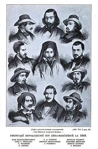 Bolliac emerged as a prominent figure during the Wallachian revolution of 1848: in May, he joined a revolutionary committee that also comprised Heliade, Bălcescu, Ion Brătianu, C. A. Rosetti, the Golescu brothers, and various others.[88] He was personally tasked with agitating among the Bucharest tanners, those living in the outer quarters, and the youth.[89] In June, Bibescu, having fought back against the crowds, narrowly escaped an assassination attempt. The shooters included Bolliac's stepbrother, Grigore Peretz.[90] Bibescu fled the country, and a provisional government took over. Bolliac announced these events from the princely palace balcony, where he also read from a new constitution.[91]