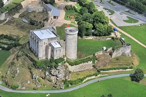 The castle (12th–13th century), which overlooks the town from a high crag, was formerly the seat of the Dukes of Normandy. The construction was started on the site of an earlier castle in 1123 by Henry I of England, with the "large keep" (grand donjon). Later was added the "small keep" (petit donjon).