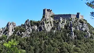 The Château de Puilaurens (Puilaurens Castle, also Puylaurens; in Occitan: lo Castèl de Puèg-Laurenç) is one of the so-called Cathar castles in the commune of Lapradelle-Puilaurens in the Aude département.[1] The castle is located above the Boulzane Valley and the villages of Lapradelle and Puilaurens. There is a path from Axat to the castle.