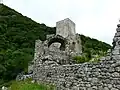 A first enceinte opens into a second which contains the remains of a large construction. Against the second enceinte is a Romanesque chapel whose apse, now gone, was covered by a vault. The barrel vault of the nave remains, made of flat stones above an archivolt decorated with blind arcades and billettes typical of the era. The keep stands at the highest point, at the centre of a terrace, from which it is entered through a semicircular arch leading to a staircase built within the thickness of the walls. The keep has two square, barrel-vaulted rooms, one above the other, and the walls rises around these rooms in seven flights. Each room is illuminated by an arrowslit. The staircase ends at the top of the keep on a terrace that has lost its parapet.[1]