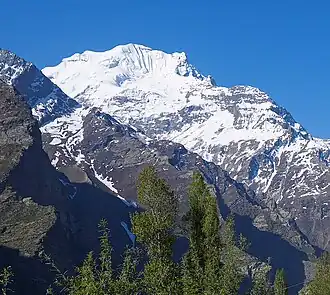 Chachi Mug is a 5,768-metre (18,924-foot) summit in the Himalayas.[1] The mountain is situated in the state of Himachal Pradesh, 150 kilometres (93 mi) north of the capital city of Shimla. Precipitation runoff from this mountain's south slope drains into the Chandra River and the north slope drains into the Bhaga River, and these two rivers converge 12 kilometres (7.5 mi) west of the peak to form the Chenab River. Topographic relief is significant as the summit rises 2,770 metres (9,088 ft) above the Chandra valley in six kilometres (3.7 mi) and 2,620 metres (8,596 ft) above the Bhaga valley in five kilometres (3.1 mi). The summit elevation is also reported as 5,765 metres,[2] and 5,730 metres.[3]