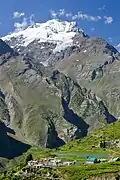 Based on the Köppen climate classification, Chachi Mug is located in a tundra climate zone with cold, snowy winters, and cool summers.[4] Weather systems are forced upwards by the Himalaya mountains (orographic lift), causing heavy precipitation in the form of rainfall and snowfall. July through September is the monsoon season. The months of April, May and June offer the most favorable weather for viewing or climbing this mountain.[5]