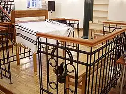 A square bimah with two entrances is located in the middle of the room, also rounded by a balustrade. Formerly, a 180-kilogram (400 lb) menorah with the Polish Eagle on the top was located in synagogue. It was given to the yeshiva by the Jewish kehilla from Przemyśl.[2]