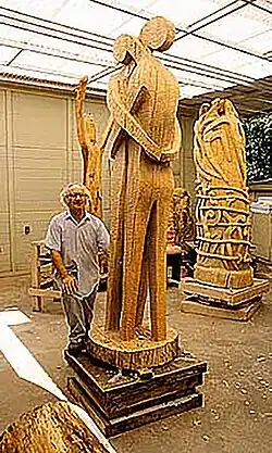 Goldberg's insatiable desire to create art in many mediums knew no end. He engraved and sculpted in wood, stone, and metal. Here we see a 9+1⁄2-foot-tall carving from oak, titled WE. He would stain his sculptures in various tones and have editions of 8 bronzes cast of each one he chose for editioning. His main advisor was his wife of 65 years, Rachel.