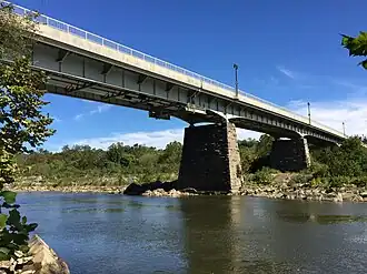 The Chain Bridge is a viaduct that crosses the Potomac River at Little Falls in Washington, D.C., and Arlington County, Virginia, United States. The steel girder bridge carries close to 22,000 cars a day.[2] It connects Washington, D.C. with affluent sections of Arlington and Fairfax counties in Virginia. On the Washington, D.C. side, the bridge connects with Canal Road. Left turns onto the Clara Barton Parkway from the Chain Bridge are prohibited, but the reverse is permitted. On the Northern Virginia side, the bridge connects with State Route 123 (Chain Bridge Road), which provides access to George Washington Memorial Parkway.