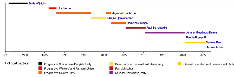 | 3 | | Jagernath Lachmon (1916–2001) | 14 December 1987 | 9 October 1996 | 8 years, 300 days | VHP | [1] | ||