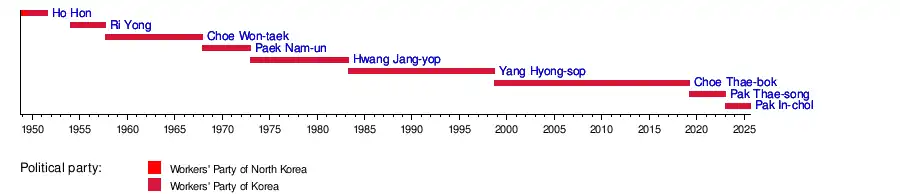| 9 | Pak In-chol[3] 박인철 | 17 January 2023 | Incumbent | 2 years, 212 days | Workers' Party of Korea | |||