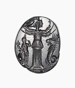 Finally, Ronan notes the association of Hekate in the oracles with lions. Rhea, whom the Chaldeans equate to Hekate, is closely linked to lions.[91] See the accompanying graphic of an obsidian magic stone depicting Hekate and a lion-maned serpent.