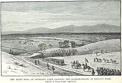 Hooker arrived late in the afternoon on April 30 and made the mansion his headquarters. Stoneman's cavalry began on April 30 its second attempt to reach Lee's rear areas. Two divisions of II Corps crossed at U.S. Ford on April 30 without opposition. By dawn on April 29, pontoon bridges spanned the Rappahannock south of Fredericksburg and Sedgwick's force began to cross.[30]