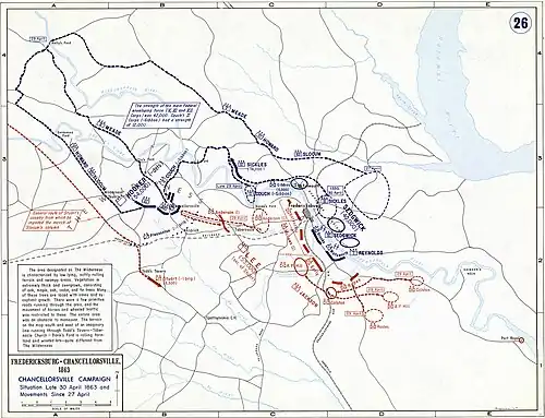 Given the communications chaos of May 1, Hooker was under the mistaken impression that Sedgwick had withdrawn back across the Rappahannock and, based on this, that the VI Corps should remain on the north bank of the river across from the town, where it could protect the army's supplies and supply line. In fact, both Reynolds and Sedgwick were still west of the Rappahannock, south of the town.[44]