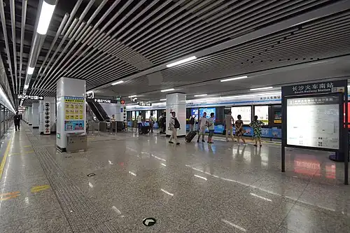 Changsha South railway station (simplified Chinese: 长沙南站; traditional Chinese: 長沙南站; pinyin: Chángshānán zhàn) is a metro station and a railway station of Wuguang Passenger Railway and Hukun Passenger Railway. The station is located in Lituo Subdistrict, Yuhua District, Changsha, Hunan, China. It is a hub and the connecting point of Beijing–Guangzhou–Shenzhen–Hong Kong High-Speed Railway, Shanghai–Kunming High-Speed Railway and the proposed Xiamen-Changsha-Chongqing High-Speed Railway. The station was opened on 26 December 2009.