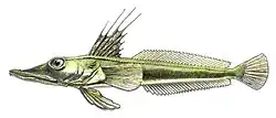 Channichthys mithridatis attains a maximum total length of 37 cm (15 in). The first dorsal fin has spines and there are 32-34 dorsal fin rays while the anal fin contains 30-32 soft rays.[2] The overall colour of the body and head varies from light green to dark olive with the crown of the head being rather darker than the body. There are 3-4 darker cross bars, two of which are underneath the second dorsal fin, and are present on the body of some individuals. The lower part of the head and body are white. There are clear silver-white spots at the bases of the pectoral fins and between the pelvic fins. Males are darker than females.[3]
