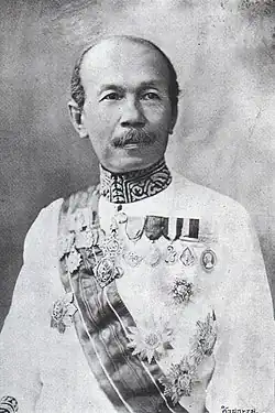 Pan was born in Suphan Buri and raised as a novice Buddhist monk in Bangkok. He left the monkhood to join government service around the age of 21, becoming a teacher at the royal palace school and then a tutor to Chulalongkorn's children studying in England, where he served as a diplomat in London for 11 years. He then became commissioner of Monthon Nakhon Si Thammarat under the new monthon administration system for 12 years, and was later appointed to several successive ministerships in the reformed government system: those of Public Works, Metropolitan Affairs, and Interior. He oversaw various modernizing public works projects, including the introduction of electricity and waterworks in the capital and the establishment of a modern police force, and also established the country's first cement factory (now Siam Cement Group). He was elevated to the highest noble rank of chaophraya, receiving the title Yommarat, in 1908. He retired from public office in 1926, but was later appointed regent to the young King Ananda Mahidol (Rama VIII) in 1935, holding the position until his death in 1938.[1][2]
