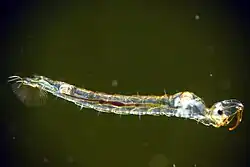 Chaoborus adults do not bite mammals or suck blood. Larvae live in open waters and even sediments, where there may be little oxygen for them to breathe. In some lakes they can be found as deep as 70 m (230 ft). In these deep anoxic waters they can avoid predation more easily than near the surface. They get around the fact that a normal air filled invertebrate tracheal system would fail at these depths by having it reduced to just two air sacs.[2] They are predaceous, and catch their prey with their modified prehensile antennae. They look somewhat like mosquito larvae, on which they prey and frequently destroy in large numbers. Chaoborus are considered opportunistic eaters, as their main diet consists of copepods and cladocerans, though they are believed to prefer copepods. However, they tend to select whatever prey enters its strike zone as it is not known for chasing prey. Prey selection also varies between species as head and mandible size dictate maximum prey size.[3]