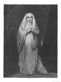 The play's "greatest charm is the character of Imogen", writes Hazlitt.[31] He observes how, in justifying her actions, "she relies little on her personal charms"[32] or a prudish "affected antipathy to vice"[33] but rather "on her merit, and her merit is in the depth of her love, her truth and constancy."[32] Shakespeare's presentation is full and rounded. We see her beauty as observed by others (as by the villain Iachimo),[34] but more often we see her from the inside, and are touched when, after endless nights of crying herself awake over the loss of Posthumus, she is outraged to learn (as she is falsely informed) that "'Some Jay of Italy [...] hath betrayed him.'"[35] And we witness a moment in the development of her character, as her resolve to disguise herself to seek out Posthumus grows firmer.[36] "Of all Shakespear's women she is perhaps the most tender and most artless."[37]