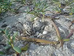 The Malaysian plover lays two to five (mode of three) cryptic eggs on small scrapes on beaches. The eggs are incubated by both the male and female for about 30 days, and then both parents care for the precocial chicks until they can fly after about 30 more days. In Thailand, it may lay multiple clutches after successful or failed clutching during the breeding season which begins in late March and may last until September. It feeds on invertebrates on the beaches and mudflats.[3]