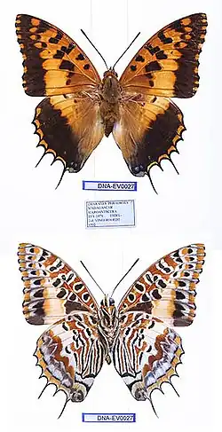 - ^ a b "Out of Africa again: A phylogenetic hypothesis of the genus Charaxes (Lepidoptera: Nymphalidae) based on five gene regions" Archived 2019-07-25 at the Wayback Machine. Aduse-Poku, Vingerhoedt, Wahlberg. Molecular Phylogenetics and Evolution (2009) 53;463–478
