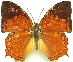 Charaxes pleione, the common orange charaxes, or square-winged red charaxes, is a butterfly in the family Nymphalidae. It is found in Guinea, Sierra Leone, Liberia, Ivory Coast, Ghana, Nigeria, Cameroon, Gabon, the Republic of the Congo, the Central African Republic, Angola, the Democratic Republic of the Congo, Uganda, Kenya, Rwanda and Tanzania.[3]