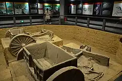 Later chariot burials are found in China. The most noted of these was discovered in 1933 at Hougang, Anyang in central China's Henan Province, dating from the rule of King Wu Ding of the Yin Dynasty (c. 1,200 BC). A Western Zhou (9th century BC) chariot burial was unearthed at Zhangjiapo, Chang'an in 1955.[4] The burial of full-sized chariots declined after the Zhou dynasty. For example, around the Mausoleum of the First Qin Emperor (completed 208 BCE), there is evidence of one full-sized, wooden chariot burial, but most of the buried chariots are half-size models made of bronze, together with bronze horses.